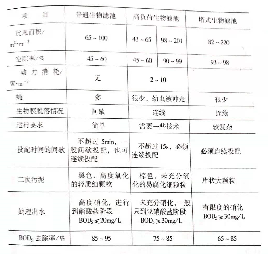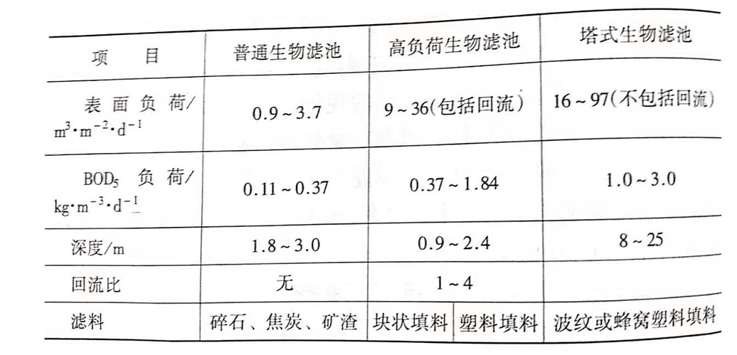 常見的生物濾池有普通生物濾池、高負(fù)荷生物濾池和塔式生物濾池等三種,下面的表格列出了這三種生物濾池的基本參數(shù)。
