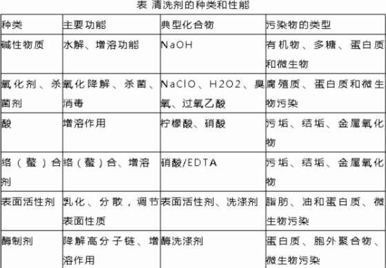 膜清洗常用清洗劑的類別和性能如下表: